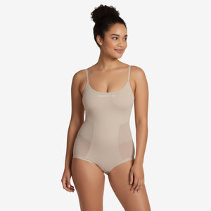Elevate your everyday look with this versatile piece that combines shaping and style. It provides moderate compression across the mid-tummy for a smooth, flattering silhouette, while the built-in bra with an elastic underbust band offers gentle support without padding. Made from lightweight, breathable fabric, it stays cool and comfortable all day. A ruched back seam enhances natural curves, and the seamless back ensures no visible panty lines. The cotton-lined hook-and-eye gusset is adjustable for a perfect fit.